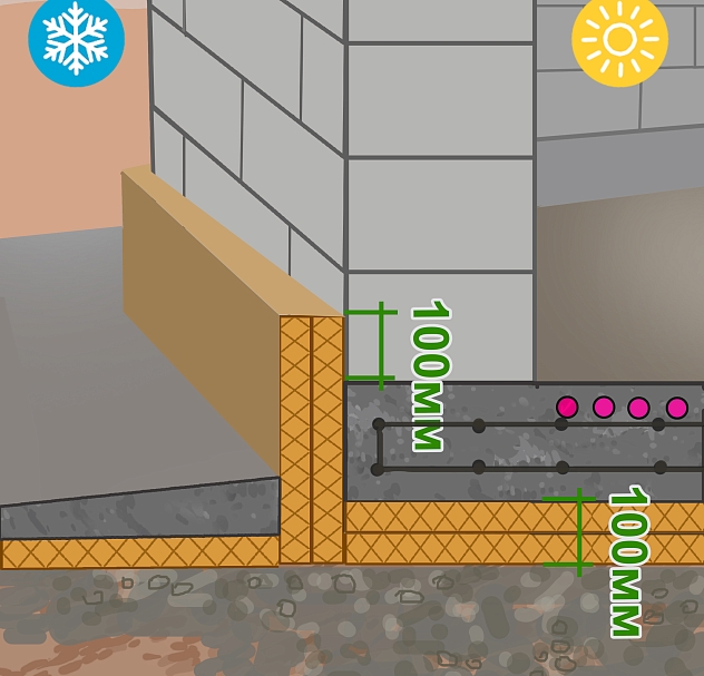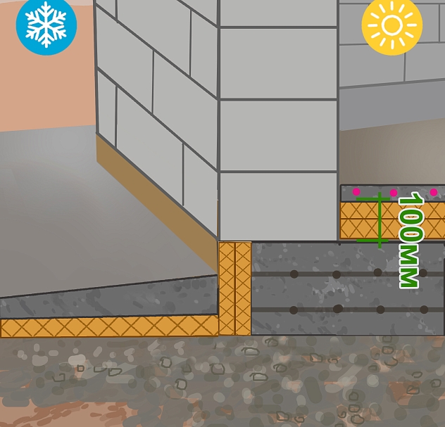 4. Фундаментная плита обязательно утепляется с торца Пеноплэксом (минимум 2 слоя по 50 мм). В случае устройства "теплого пола" в плите, добавляется утепление Пеноплэксом под плитой (минимум 2 слоя по 50 мм).