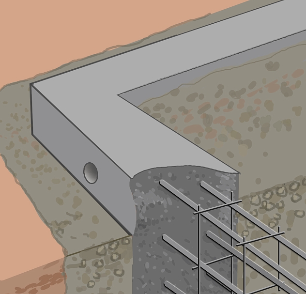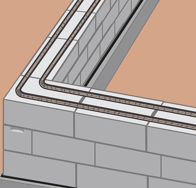 22. На углах и пересечениях стен армирование выполнять неприрывно с загибом по форме стены. Для армирования использовать стальную или композитную арматуру периодического профиля. Стальная d=8мм, композитная d=6мм. При стыке арматуры увязывается хомутами или вязальной проволокой.