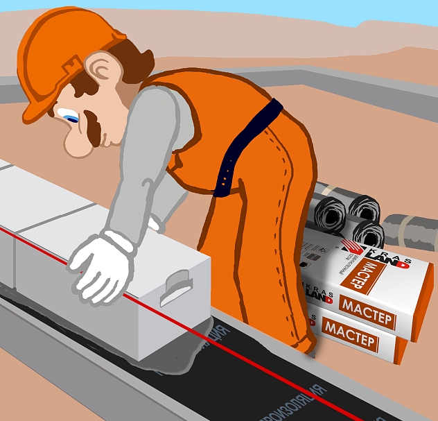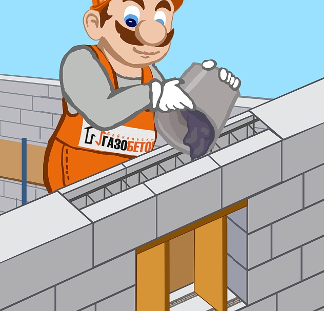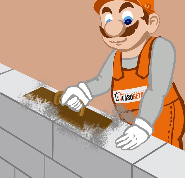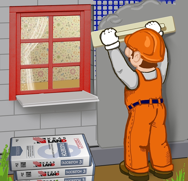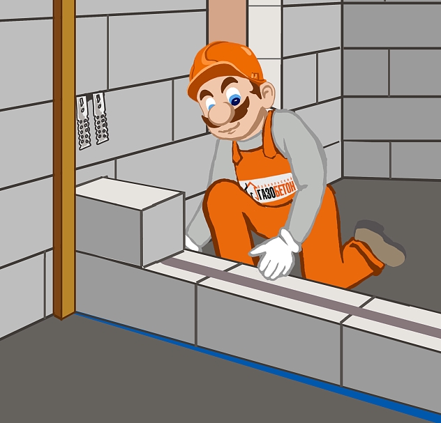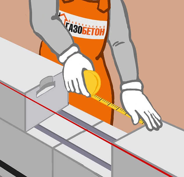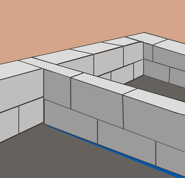 11. От выполнения кладки первого ряда блоков зависит качество всего дома. Между фундаментом и кладкой необходимо выполнить гидроизоляцию по внешней отметке фундамента. Первый ряд блоков следует укладывать на выравнивающий слой цементно-песчаного раствора Krasland МАСТЕР
