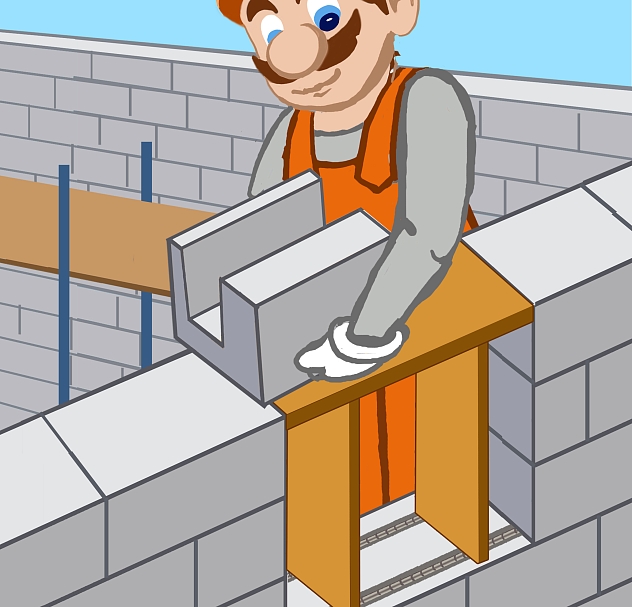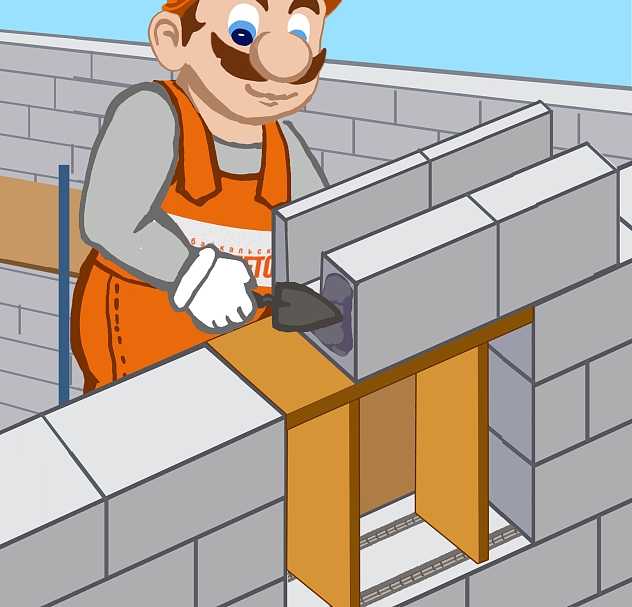 28. Для перекрытия оконных и дверных проемов из U-образных блоков формируются перемычки нужной длины с учетом ширины проема. Для этого над оконным или дверным проемом устанавливается опалубка из деревянного бруса или металлических профилей.