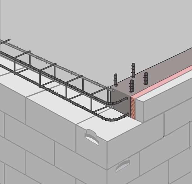 37. Верхний ряд блоков под перекрытием выкладывается из U-образных блоков. По всему периметру в U-образных блоках монтируется арматурный каркас. Затем выемка U-образных блоков заливается тяжелым бетоном (по принципу монтажа перемычек)
