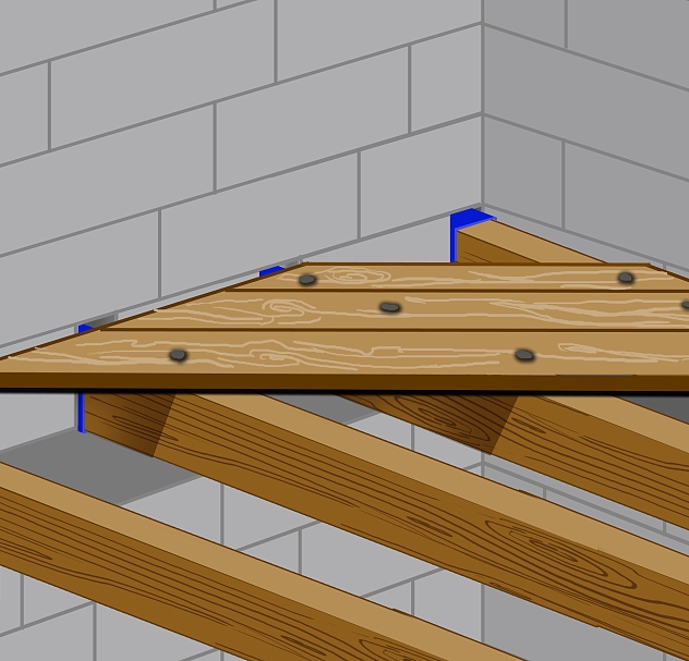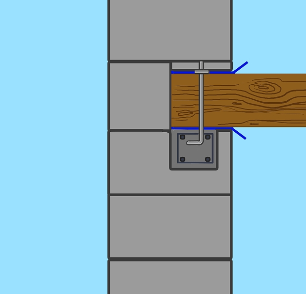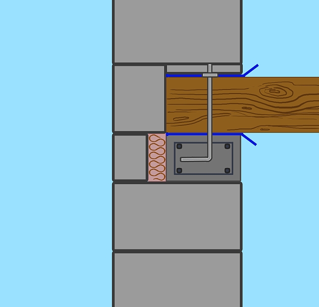 47. Длина опирания деревянных балок на стены из штучных материалов и бетона болжна быть не менее 200 мм. Для расспределения нагрузок от балок, опирание производится на армированный железобетонный антисейсмический пояс