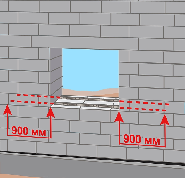 53. Следует армировать зоны под оконными проемами. Арматура должна быть заведена на 900 мм в каждую сторону от края проема.