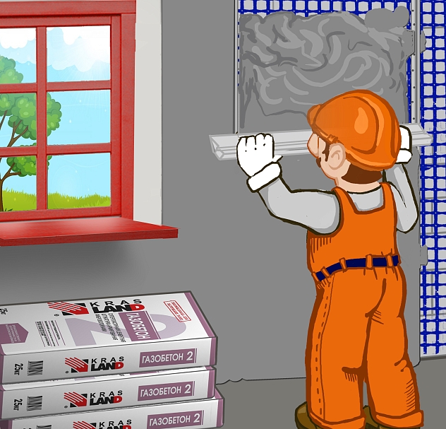63. Оштукатуривание фасада следует проводить после просыхания штукатурки внутри. Перед оштукатуриванием поверхность стены их газобетона пропитать укрепляющей пропиткой Krasland G02 с увеличенным содержанием дисперсии