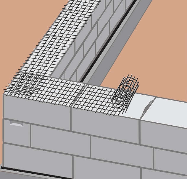 25. Внутренние стены армировать так же, как наружные стены. Для армирования стен толщиной 180 мм или менее использовать один стержень d 8 мм. Для стен толщиной более 180 мм использовать два стержня или композитную армирующую сетку.