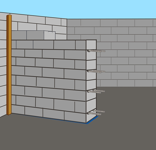 26. Каждый второй ряд перегородки и наружные стены связать оцинкованной стальной перфорированной лентой, ранее установленной в несущей стене. Внутренние и наружные несущие стены перевязывать кладкой или с применением Т-образных анкеров.