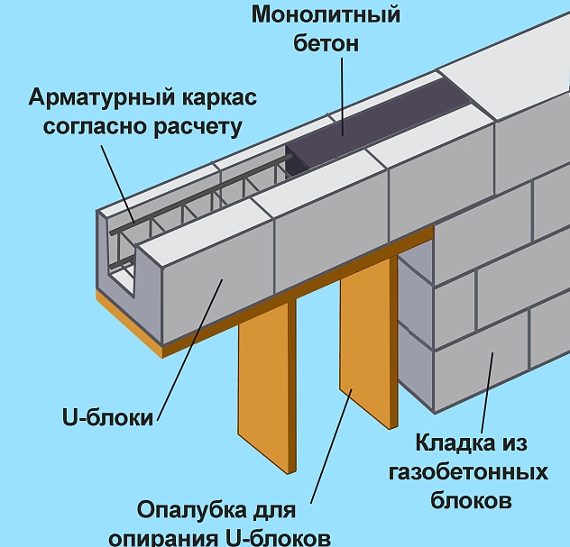 30. В выемку U-образных блоков укладывается арматурный каркас. Диаметр арматуры и марка бетона для заполнения подбирается по расчету в зависимости от воспринимаемой нагрузки.