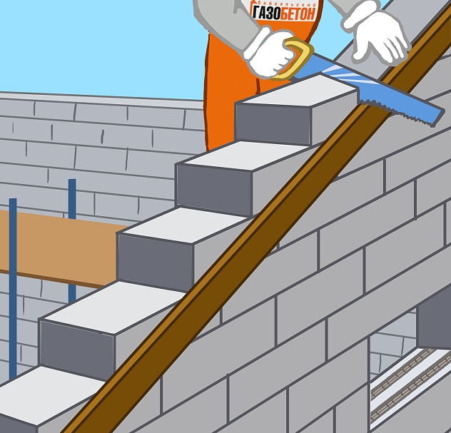 36. Для формирования необходимого наклона кладки использовать ножовку и рубонок для газобетона (см. инструменты). Поверх стены устраивается антисейсмический (армированный) пояс с применением U-образных блоков.