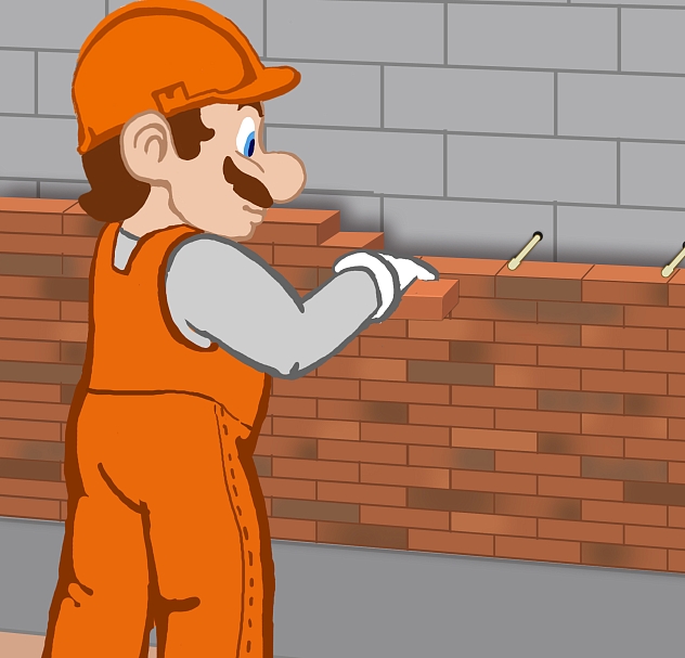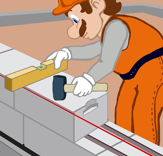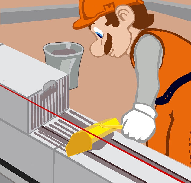 13. Установка каждого блока контролируется по уровню и шнуру-причалке. Для точного позиционирования блоков в кладке используется резиновая киянка (см. инструменты)