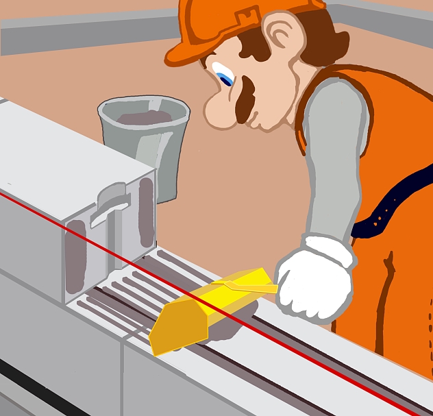 20. Первый и каждый 3-й ряд кладки необходимо армировать (для сейсмичных районов каждый 2-й ряд). В штробу, предварительно подготовленную ручным штроборезом (см. инструменты) и обеспылену. С помощью щетки-смётки (см. инструменты), заполнить клеевым раствором и уложить арматуру. Клей должен полностью покрывать арматуру. Излишки клея удаляются.